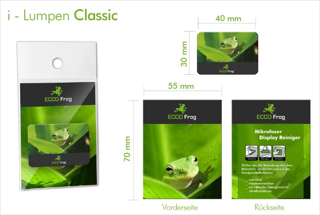 Der i-Lumpen Classic ist unser meist gekaufter Artikel. Diesen bieten wir Ihnen zu unseren besten Konditionen an. Zum Produktumfang gehören alle dargestellten Details. Der i-Lumpen in der Größe 30 x 40 mm, eine 4/4 bedruckte Rückenpappe mit den Maßen 70 x 55 mm sowie eine schützende Umverpackung mit Loch.